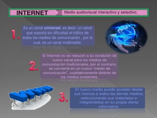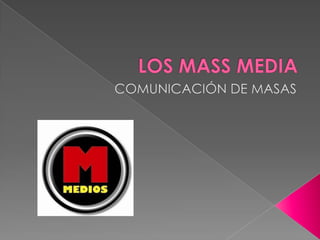 Los medios de comunicación son canales artificiales que transmiten mensajes a un público colectivo, empleando tecnología compleja y costosa, y su comunicación es generalmente unilateral. Desde la antigüedad hasta la era moderna, han evolucionado desde manuscritos hasta tecnologías como la televisión e internet, y se clasifican en medios de banda ancha y estrecha según el tipo de público al que se dirigen. Los medios masivos son esenciales en la sociedad actual, influyendo en la información, valores culturales y la dinámica del poder social.