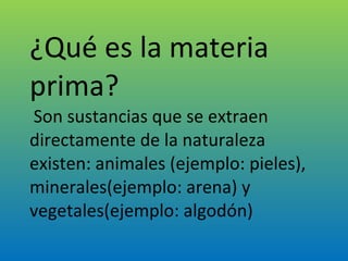 El documento describe los conceptos básicos de materia prima, materiales y productos tecnológicos. Explica que la materia prima se extrae de la naturaleza y se transforma en materiales mediante procesos físicos y/o químicos, los cuales luego son usados para fabricar productos tecnológicos. También menciona los seis materiales más importantes y describe varias propiedades de los materiales, incluyendo propiedades químicas, térmicas, eléctricas, mecánicas, tecnológic