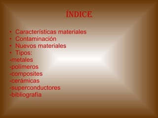 El documento resume las características y tipos de diferentes materiales, incluyendo metales, polímeros, compuestos y cerámicas. Describe propiedades mecánicas, eléctricas, químicas y térmicas de los materiales. También cubre temas como contaminación, nuevos materiales como nanomateriales e inteligentes, y tipos específicos como metales, aleaciones y polímeros.