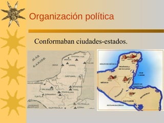 Los mayas se organizaban en ciudades-estados y se dedicaban a la agricultura intensiva del maíz y al comercio. Desarrollaron una cultura avanzada con logros arquitectónicos como las pirámides escalonadas, y sistemas de calendario, escritura, astronomía y matemáticas. Creían en dioses como Itzamna, Chac y Kukulkán, y celebraban rituales religiosos vinculados a la naturaleza.