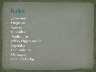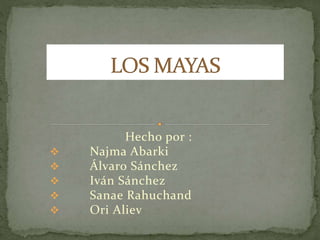 Los mayas fueron una civilización mesoamericana que abarcó partes de Belize, Yucatán, México, Guatemala y Honduras, con tradiciones y religiones compartidas. Su organización política estaba dirigida por el Halach Uinic, asistido por un consejo de jefes y sacerdotes, y celebraban ceremonias para la agricultura y el calendario sagrado. Además, hicieron contribuciones notables como la invención del chicle y desarrollaron un calendario más preciso que el gregoriano.
