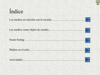 Este documento presenta información sobre los medios de comunicación y su relación con la escuela. Incluye un índice con diferentes secciones como los medios como objeto de estudio, Susan Sontag y actividades relacionadas con los medios en el aula. También contiene preguntas y ejercicios para analizar diferentes mensajes mediáticos y elegir los medios más adecuados para comunicar diferentes tipos de información.