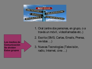 Este documento describe los diferentes tipos de medios de comunicación, incluyendo la comunicación oral, escrita y las nuevas tecnologías. Explica que los medios de comunicación sirven para informar, educar, entretener y formar opiniones. Además, detalla los requisitos de la comunicación oral y escrita, y cómo las nuevas tecnologías como los teléfonos móviles y las redes sociales han facilitado la comunicación global.