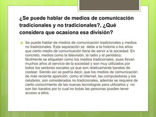 Los medios de comunicación tradicionales como la televisión, la radio y los periódicos se han adaptado a las nuevas tecnologías para mantenerse vigentes. Los dispositivos más utilizados en educación son las computadoras e Internet, aunque los estudiantes usan más celulares y tabletas, no siempre con fines educativos. Es importante que los medios aprovechen el potencial de la tecnología sin simplificar el lenguaje ni confundir información con conocimiento.