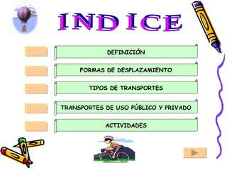 El documento define los medios de transporte como formas de trasladar personas o mercancías de un lugar a otro. Explica que hay tres tipos principales según el medio - aéreo, terrestre y marítimo. Proporciona ejemplos de diferentes vehículos para cada tipo y distingue entre transportes públicos y privados. Finalmente, incluye algunas preguntas sobre los diferentes medios.