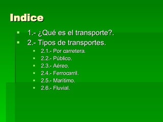 Este documento describe los diferentes tipos de transporte, incluyendo transporte por carretera (camiones, coches, motos y bicicletas), transporte público (autobuses, taxis y metro), transporte aéreo (aviones, helicópteros y globos), transporte ferroviario, transporte marítimo, y transporte fluvial. Explica brevemente cada modo de transporte y proporciona ejemplos ilustrativos.