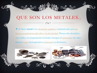 Este documento describe las propiedades de los metales. Explica que los metales son buenos conductores del calor y la electricidad y se obtienen principalmente de minas mediante fundición. Divide la historia del uso de metales en tres edades: la Edad del Cobre, la Edad del Bronce y la Edad del Hierro. También describe las propiedades físicas y mecánicas de los metales.
