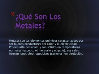 Los metales son elementos químicos que son buenos conductores del calor y la electricidad, tienen alta densidad y son sólidos a temperaturas normales. La mayoría se encuentran en la naturaleza combinados con otros elementos en minerales, y su obtención implica procesos para separarlos de forma elemental. Las edades del cobre, bronce e hierro marcan etapas en el desarrollo de la metalurgia por parte de las sociedades antiguas, asociadas a cambios tecnológicos y culturales. Los metales poseen propiedades f