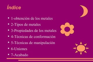 Este documento trata sobre los metales y sus propiedades. Explica que los metales se obtienen a partir de minerales usando técnicas como tamizado, filtración y flotación. Luego clasifica los metales en ferrosos como el hierro y no ferrosos como el cobre. Describe las propiedades físicas, químicas y ecológicas de los metales. Finalmente, detalla técnicas para conformar, manipular, unir y dar acabado a los metales.