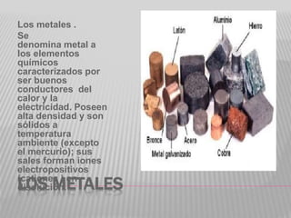 Este documento describe las propiedades de los metales. Los metales son buenos conductores del calor y la electricidad, son sólidos a temperatura ambiente (excepto el mercurio), y forman iones electropositivos en disolución. Históricamente, metales como el oro, la plata y el cobre se usaron desde la prehistoria, y el descubrimiento del bronce marcó el inicio de la Edad de Bronce. Los metales comunes tienen propiedades como la maleabilidad, ductilidad, resistencia mecánica y capacidad para conducir cal