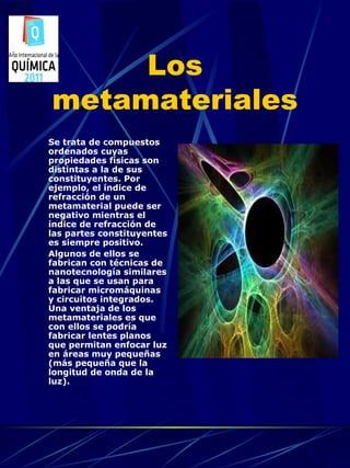 Los metamateriales son compuestos ordenados cuyas propiedades físicas, como el índice de refracción, difieren de las de sus componentes individuales. Algunos metamateriales se fabrican usando técnicas de nanotecnología y tienen la ventaja de permitir la fabricación de lentes planos capaces de enfocar la luz en áreas más pequeñas que la longitud de onda de la luz.