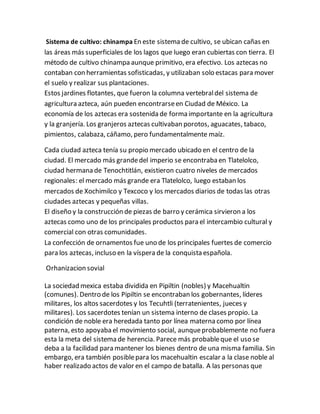 Los mexicas (aztecas) emigraron de Aztlán siguiendo las indicaciones de su dios Huitzilopochtli y llegaron al Valle de México en 1325, donde fundaron Tenochtitlán. Desarrollaron una agricultura efectiva usando el método de chinampas y mercados para comerciar. Su sociedad estaba dividida en nobles y comunes. Políticamente estaba organizada en altepetls gobernados por tlatoanis. Su religión incluía sacrificios humanos a diversos dioses. Finalmente, fueron conquistados