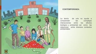 El documento describe la teoría ecológica del desarrollo humano de Bronfenbrenner, la cual propone que el desarrollo de un individuo está influenciado por múltiples sistemas ambientales, incluyendo el microsistema (familia, escuela), mesosistema (interacción entre microsistemas), exosistema (entornos que no involucran al individuo directamente), macro sistema (valores culturales) y cronosistema (eventos históricos). El desarrollo está determinado por la interacción dinámica entre el