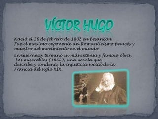 La novela Los Miserables de Víctor Hugo describe la injusticia social en la Francia del siglo XIX y sigue la historia de Jean Valjean, un hombre que pasa décadas siendo perseguido por su pasado criminal. La obra también presenta a otros personajes como Cossette, Marius y Javert y trata temas como la pobreza, el perdón y la redención.