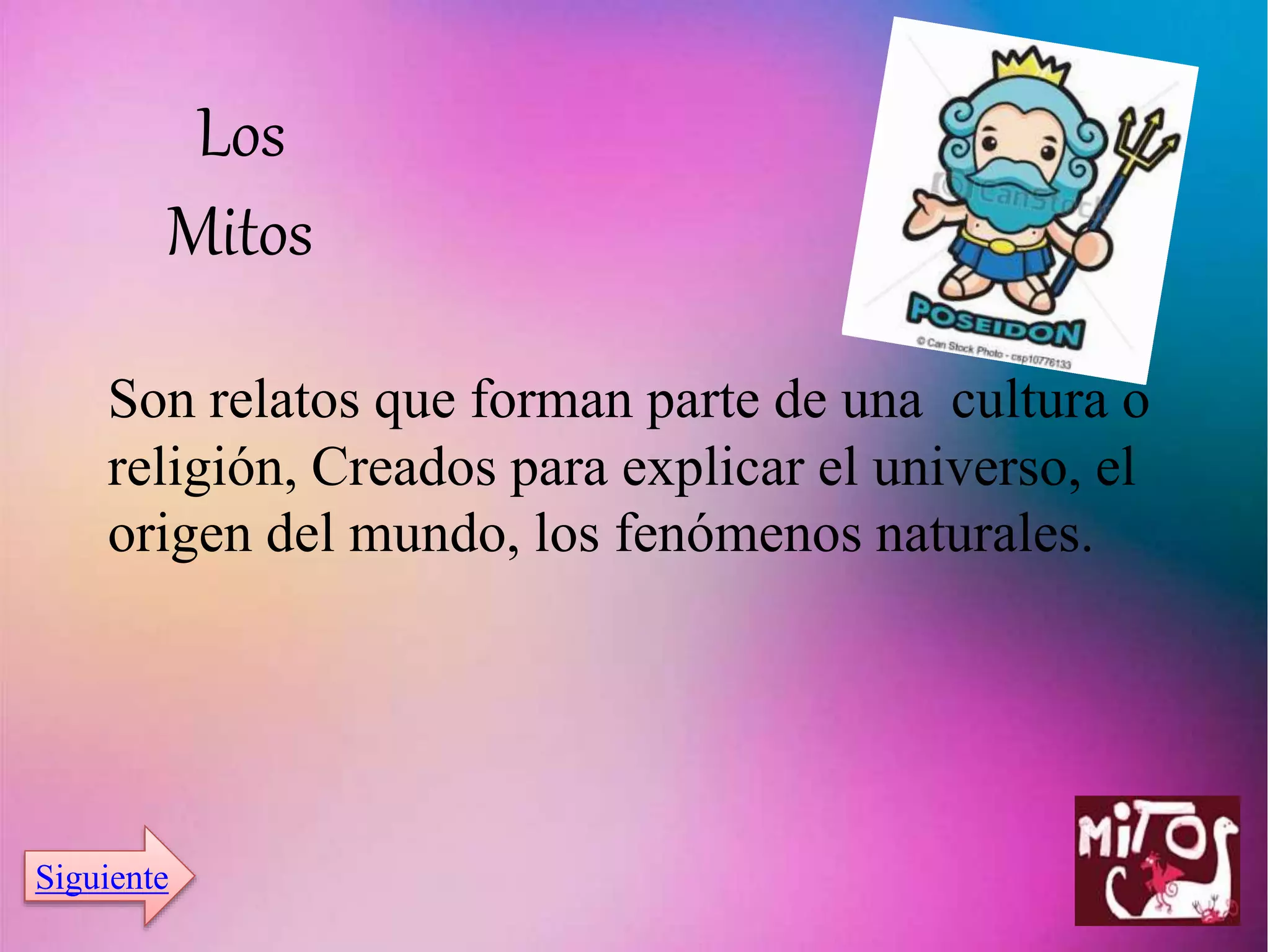 Los mitos son relatos creados por culturas y religiones para explicar fenómenos naturales, el origen del mundo y del universo. Existen varios tipos de mitos como los teogónicos sobre el origen de los dioses, los cosmogónicos sobre la creación del mundo, los etiológicos sobre el origen de seres y cosas, y los escatológicos sobre el fin del mundo.