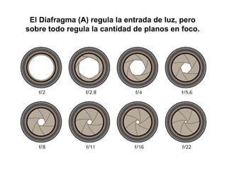 Los tres pilares fundamentales de la fotografía son la apertura (A), la velocidad de obturación (S) y la sensibilidad ISO. La apertura regula la cantidad de luz y los planos enfocados. La velocidad de obturación determina si una imagen se captura congelada o desplazada. La sensibilidad permite mayor velocidad de obturación o profundidad de campo a costa de ruido y menor definición. Los modos automáticos de las cámaras ajustan estos pilares para escenas como retrato, p