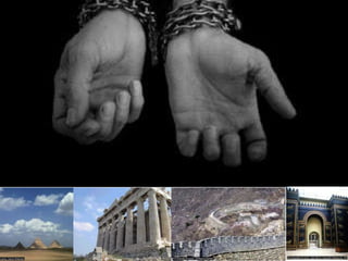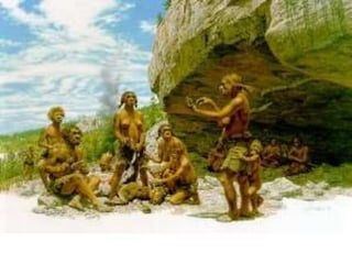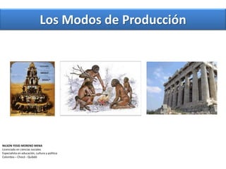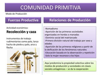 Este documento resume los principales modos de producción a lo largo de la historia humana, incluyendo la comunidad primitiva, el esclavismo y el feudalismo. Describe las fuerzas productivas, las relaciones de producción y las actividades económicas características de cada modo de producción. Finalmente, introduce el surgimiento de la burguesía y el capitalismo como el modo de producción dominante actual.