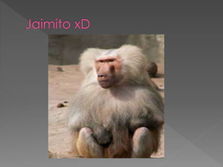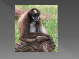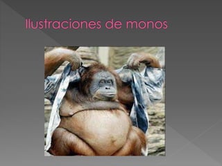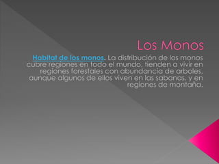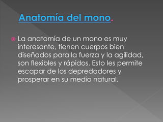 Este documento resume las características de varias especies de monos, incluyendo su anatomía, hábitos alimenticios, hábitat y otras particularidades. Describe monos como el capuchino, mono azul, tití común, mono ardilla, gibón, tití león dorado, mono aullador, macaco japonés, mandril, mono narigudo y tití pigmeo. Explica que algunos monos pertenecen al Viejo Mundo mientras que otros son del Nuevo Mundo, y que varían en tamaño, coloración y