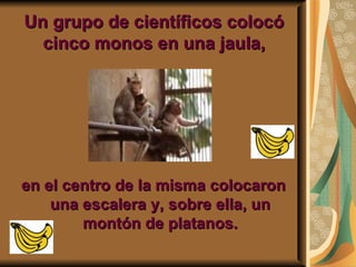 Los científicos colocaron cinco monos en una jaula con una escalera y plátanos. Cuando un mono subía, los otros recibían chorros de agua fría. Luego, los monos golpeaban a cualquier mono que intentara subir, incluso cuando los científicos reemplazaron a todos los monos originales, estableciendo así un paradigma en el que los monos golpeaban a otros sin saber por qué.