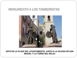 El documento describe varios monumentos en la localidad de Mula, incluyendo el Monumento a los Tamboristas en la plaza principal, el Monumento a los Nazarenos que representa a un adulto y niño dando caramelos durante la Semana Santa, y un busto dedicado al escultor Sánchez Lozano. También menciona una fuente antigua, la escultura Mullae en el parque que lleva su nombre, una locomotora que recuerda el antiguo tren y el escudo de Mula, así como la Tortuga Faro y las ruinas del Castillo