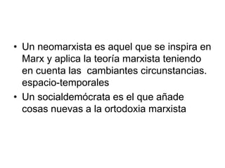 Lenin fue uno de los neomarxistas más importantes. Desarrolló tres ideas clave que no habían sido tratadas por Marx: el imperialismo como última fase del capitalismo, el papel del partido comunista como vanguardia del proletariado y la dictadura del proletariado para suprimir el pensamiento burgués y establecer una democracia directa. Otras figuras como Stalin, Mao, Gramsci y Bernstein también aportaron nuevas perspectivas al marxismo adaptándolo a sus respectivos contextos históricos y sociales.