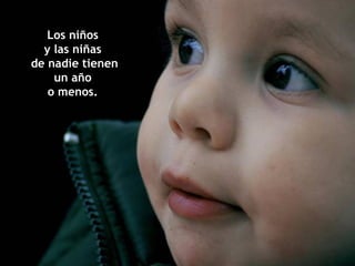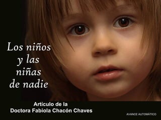 El documento habla sobre los niños y niñas que sufren maltrato y abandono. Describe que estos niños no conocen el amor de sus padres y viven marcados por la violencia física y psicológica. A pesar de ser testigos de esto, la sociedad suele ignorar su sufrimiento. La autora, como doctora, ha tratado durante 8 años a estos niños con graves heridas. Lamenta no haber podido salvar a uno de ellos y pide a la sociedad comprometerse para proteger a estos niños y devolverles la
