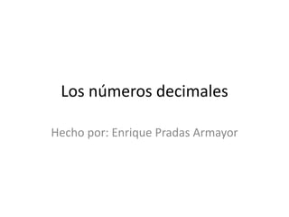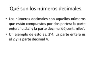 Los números decimales están compuestos de una parte entera y una parte decimal. Se leen diciendo las unidades y décimas, por ejemplo 8'5 se lee ocho coma cinco. Se pueden sumar, restar, multiplicar y dividir de forma similar a los números enteros, poniendo el punto decimal en su posición correcta.