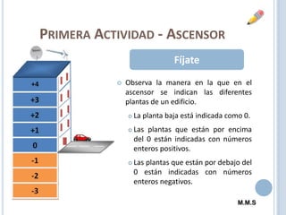 El documento presenta varias actividades sobre números enteros dirigidas a estudiantes de primaria. La primera actividad explica cómo se indican las plantas de un edificio en el ascensor usando números enteros positivos para las plantas por encima de la planta baja y números enteros negativos para las debajo. Otras actividades involucran emparejar personas con las plantas a las que van en el ascensor, calcular temperaturas máximas y mínimas, contar pasajeros que suben y bajan de un autobús, y realizar sumas y restas con