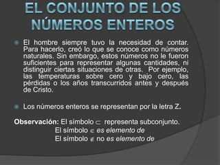 Los números enteros son la unión de tres conjuntos: los números enteros positivos (los naturales), los números enteros negativos y el cero. Los números enteros positivos se representan con el signo + o sin signo y están en el conjunto Z+. Los números enteros negativos llevan el signo - y están en el conjunto Z-. El conjunto de todos los números enteros se representa como Z y contiene todos los números enteros positivos, negativos y el cero.