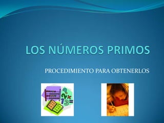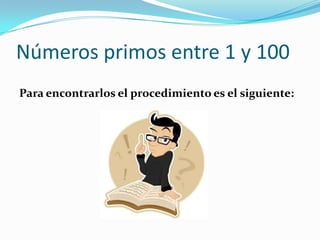 El documento describe un procedimiento para encontrar los números primos entre 1 y 100. Se crea una tabla con todos los números del 1 al 100 y se tachan sucesivamente los múltiplos de 2, 3, 5 y 7, dejando solo los números que no son divisibles por otros, los cuales son los números primos.