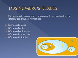 El documento describe los diferentes conjuntos numéricos que conforman los números reales. Explica que los números naturales son los utilizados para contar y no tienen parte decimal. Los números enteros incluyen a los naturales, sus opuestos y el cero. Los números racionales son aquellos que pueden expresarse como cociente de enteros, mientras que los irracionales no pueden expresarse de esa forma y tienen cifras decimales infinitas no periódicas. Algunos irracionales famosos son pi, e y la constante áurea. Finalmente, propone actividades de ref