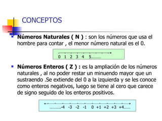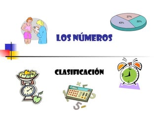 El documento describe la clasificación de los diferentes tipos de números. Explica que los números naturales (N) son los usados para contar y comienzan en 0. Los números enteros (Z) incluyen los naturales y sus opuestos, formando los números positivos y negativos. Los números racionales (Q) son aquellos que pueden expresarse como fracciones. Los números irracionales (I) son aquellos que no tienen raíz exacta. Todos estos conjuntos forman los números reales (R).
