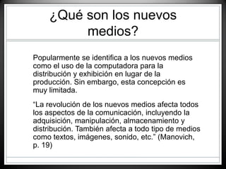 Este documento discute los nuevos medios y la cultura digital. Define los nuevos medios como aquellos que utilizan la computadora para la distribución y exhibición de contenido en lugar de solo la producción. Explica que los nuevos medios afectan todos los aspectos de la comunicación como la adquisición, manipulación, almacenamiento y distribución de textos, imágenes, sonido y más. También describe cinco principios clave de los nuevos medios propuestos por Lev Manovich: representación numérica, modularidad, automatización, variabilidad y