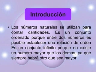 Este documento describe los números naturales, incluyendo que son un conjunto infinito y ordenado que se usa para contar cantidades. Explica la adición y sustracción de números naturales, incluyendo sus propiedades como la conmutativa, asociativa y elemento neutro. También define el número cardinal y ordinal de un conjunto.