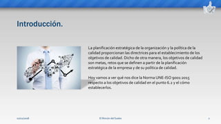 El documento presenta directrices sobre el establecimiento de objetivos de calidad en una organización, basándose en la norma UNE-ISO 9001:2015. Se enfatiza la importancia de que dichos objetivos sean coherentes, medibles y comunicados a todos los niveles de la empresa, y detalla las características SMART (Específicos, Medibles, Alcanzables, Realistas y Oportunos) que deben cumplir. Además, se indica que la alta dirección debe involucrarse en su definición y seguimiento para asegurar la mejora continua y la satisfacción del cliente.