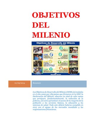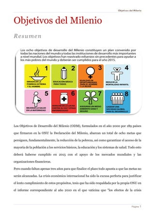 El documento describe los Objetivos de Desarrollo del Milenio (ODM), establecidos en el 2000 por 189 países de la ONU para reducir la pobreza y mejorar el acceso a servicios básicos, educación y salud para 2015. Los 8 objetivos abarcan temas como reducir la pobreza y el hambre, lograr educación primaria universal, promover la igualdad de género, reducir la mortalidad infantil y materna, combatir el VIH/SIDA y otras enfermedades, y garantizar la sostenibilidad ambiental. Sin embargo,