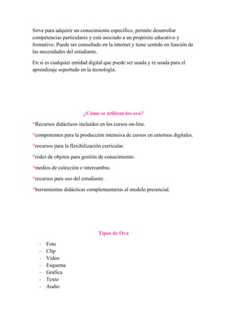 Un OVA (objeto virtual de aprendizaje) es un recurso digital educativo que se puede usar para adquirir conocimientos de manera flexible a través de la tecnología. Los OVAs pueden incluir diferentes tipos de medios como texto, video e imágenes y se utilizan comúnmente como complementos de cursos en línea o herramientas didácticas adicionales para la enseñanza presencial. Las características clave de los OVAs incluyen su reutilización, actualización fácil, bajo costo de desar