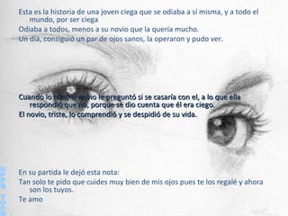 La joven ciega odiaba su ceguera y a todos menos a su novio. Después de una operación exitosa para recuperar la vista, se dio cuenta que su novio era ciego y decidió terminar la relación. Su ex novio le dejó una nota diciendo que sus ojos eran un regalo para ella.