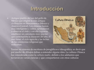 Los olmecas fueron la primera civilización mesoamericana que floreció entre el 1500 y el 900 a.C. en el sur de México. Fueron muy avanzados e influyentes, desarrollando el primer calendario, escritura y juego de pelota en Mesoamérica, así como centros urbanos complejos. Aunque su cultura declinó alrededor del 600 a.C., sus innovaciones se extendieron y tuvieron un impacto duradero en las culturas posteriores de la región.