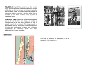 Los Onas eran un pueblo indígena nómada del norte de Tierra del Fuego que se dedicaba a la caza y recolección. Vivían en grupos familiares que construían refugios con pieles de animales y se desplazaban en busca de alimentos. Sin embargo, con la llegada de los colonizadores a fines del siglo XIX, la mayoría de los Onas fueron exterminados en sólo 20 años.