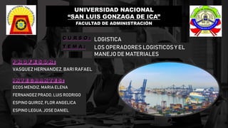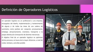 Este documento define los operadores logísticos como profesionales o empresas encargadas de diseñar, implementar y mantener las áreas de una cadena de suministro. Explica que existen cinco tipos de operadores logísticos (1PL, 2PL, 3PL, 4PL, 5PL) según su nivel de integración, y describe los servicios que brinda cada tipo. Finalmente, presenta dos casos prácticos de empresas (COPACOL y GM Technology) y cómo mejoraron sus procesos logísticos con soluciones de almacenamiento automatizado.