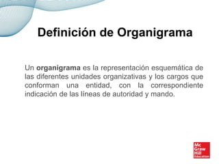 El documento describe los diferentes tipos de organigramas según su naturaleza, finalidad, ámbito, contenido y disposición gráfica. Un organigrama es una representación esquemática de las unidades organizativas y cargos de una entidad que indica las líneas de autoridad. Existen varios subtipos de organigramas clasificados en función de estos cinco criterios.