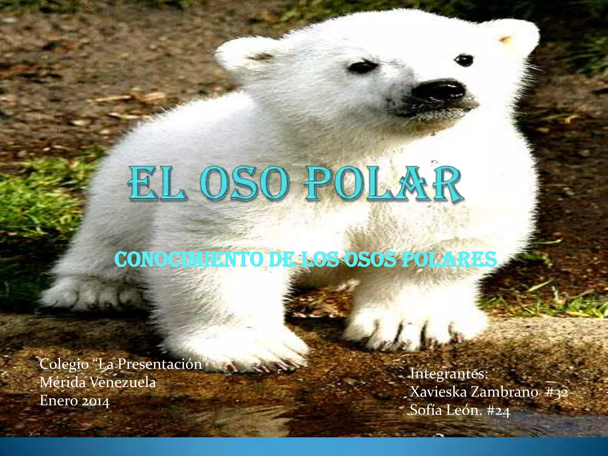 El documento proporciona información sobre los osos polares, incluyendo su descripción física, hábitat, dieta, reproducción y amenazas. Los osos polares son carnívoros que viven en el Ártico, se alimentan principalmente de focas y crías de reno, y su población está disminuyendo debido a la caza y el calentamiento global que está derritiendo su hábitat congelado.