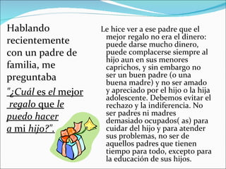 La mayoría de los padres carecen de las habilidades necesarias para educar a sus hijos adolescentes, por lo que es vital reflexionar y aprender sobre este proceso. Los adolescentes buscan amor incondicional, confianza y comprensión de sus padres, así como normas claras y consistentes, y un modelo a seguir en la conducta. Además, se necesitan diálogos abiertos y apoyo emocional para que los jóvenes se sientan seguros y valorados en su desarrollo personal.