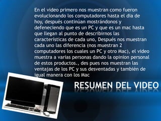 Este documento resume las principales diferencias entre computadoras PC y Mac. Explica que los PC son más comunes, funcionan con Windows/Linux, y tienen partes más accesibles y económicas. Los Mac son fabricados por Apple, usan el sistema operativo Mac OS exclusivo, y tienen ventajas como mayor velocidad y menos virus, pero son más costosos. Al final, da la opinión personal de que los PC son una mejor opción debido a su menor costo y mayor compatibilidad.