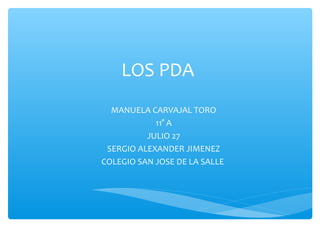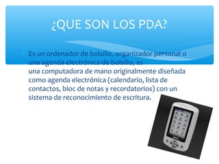 Los PDA (asistentes digitales personales) son ordenadores de bolsillo que originalmente se diseñaron como agendas electrónicas. El primer PDA fue el Apple Newton en 1992. Los PDA se hicieron populares con la compañía Palm en 1995 y luego con los sistemas operativos Windows CE y Mobile de Microsoft. Los PDA se usan para almacenar y acceder a información de forma portátil y tienen aplicaciones útiles, aunque a veces es difícil escribir en su teclado digital.