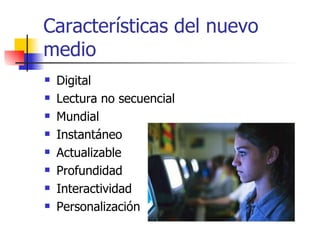 El documento describe las características del periodismo digital y los periódicos en línea, incluida la lectura no secuencial, la actualización continua y la interactividad. Explica que existen dos tipos de periodistas en línea y destaca las habilidades multimedia y de interacción necesarias. También describe tres tipos de lectores en línea y sus características como la búsqueda especializada y el gusto por interactuar.