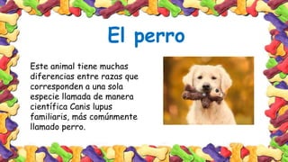 El documento describe las características de los perros. Los perros pertenecen a la especie Canis lupus familiaris y existen diferentes razas. Son mamíferos vertebrados que viven principalmente en las casas de sus dueños aunque también existen perros salvajes en África. Las perras buscan compañeros para reproducirse y dan a luz cachorros vivos después de 60 días de gestación. Los perros son omnívoros y comen tanto carne como vegetales aunque su comida favorita es la carne. Los perros son importantes en la cadena