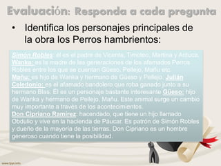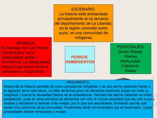 La novela Los Perros Hambrientos se ambienta en una comunidad indígena en la puna peruana y describe la desigualdad social y económica entre los campesinos y el terrateniente durante una sequía. Relata la historia paralela de los campesinos y sus perros pastores que deben enfrentar la falta de alimentos, lo que rompe el vínculo entre los perros y sus dueños y lleva a los perros a ser envenenados por el terrateniente.