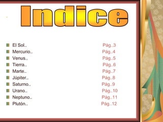 El documento presenta información sobre los nueve planetas del sistema solar, incluyendo sus nombres, distancias al sol, temperaturas de superficie, periodos de rotación y traslación, y características adicionales. También describe brevemente otros cuerpos celestes como satélites planetarios, asteroides, y el medio interestelar, así como la ubicación y movimiento de nuestra galaxia, la Vía Láctea, en el universo.